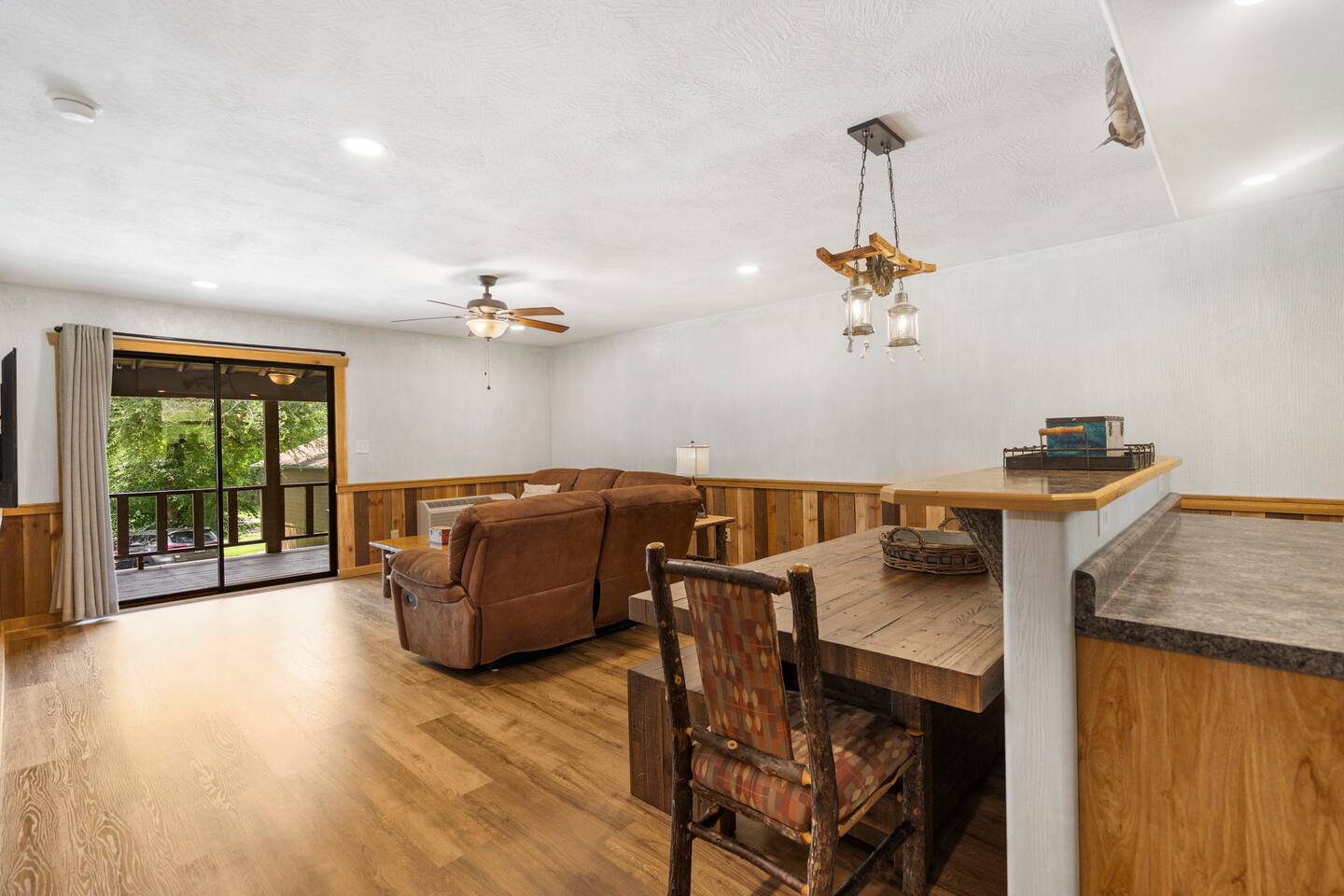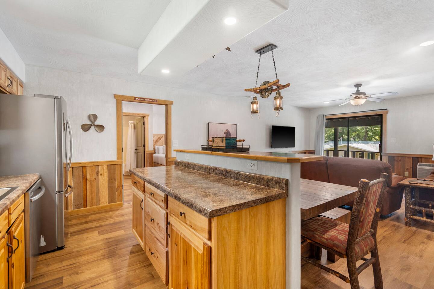 This listing is for 4 Bears Lodge, Unit #1 and features a full kitchen and living room in addition to the sleeping room with 2 queen sized beds. Enjoy over 100+ cable tv channels with YouTube TV and high speed wifi. Watch some amazing sunsets on the porch while taking in the scenic view of the lake and bluffs across the lake. The resort amenities include the swimming pool, access to boat a ramp and a dock slip is always available for a small fee, so bring your boat! Lots of walking trails and frisbee golf at Empire park next door.