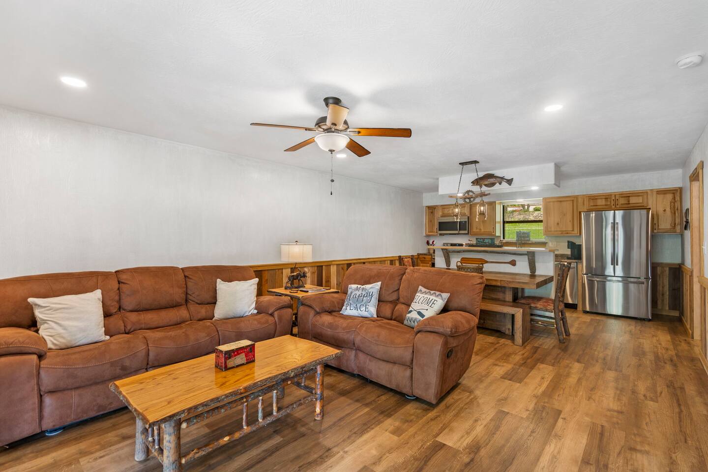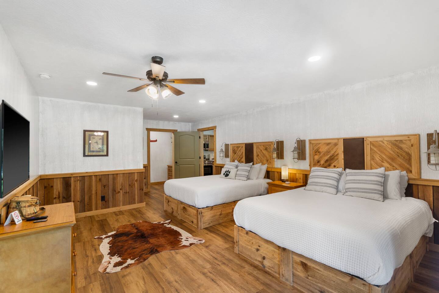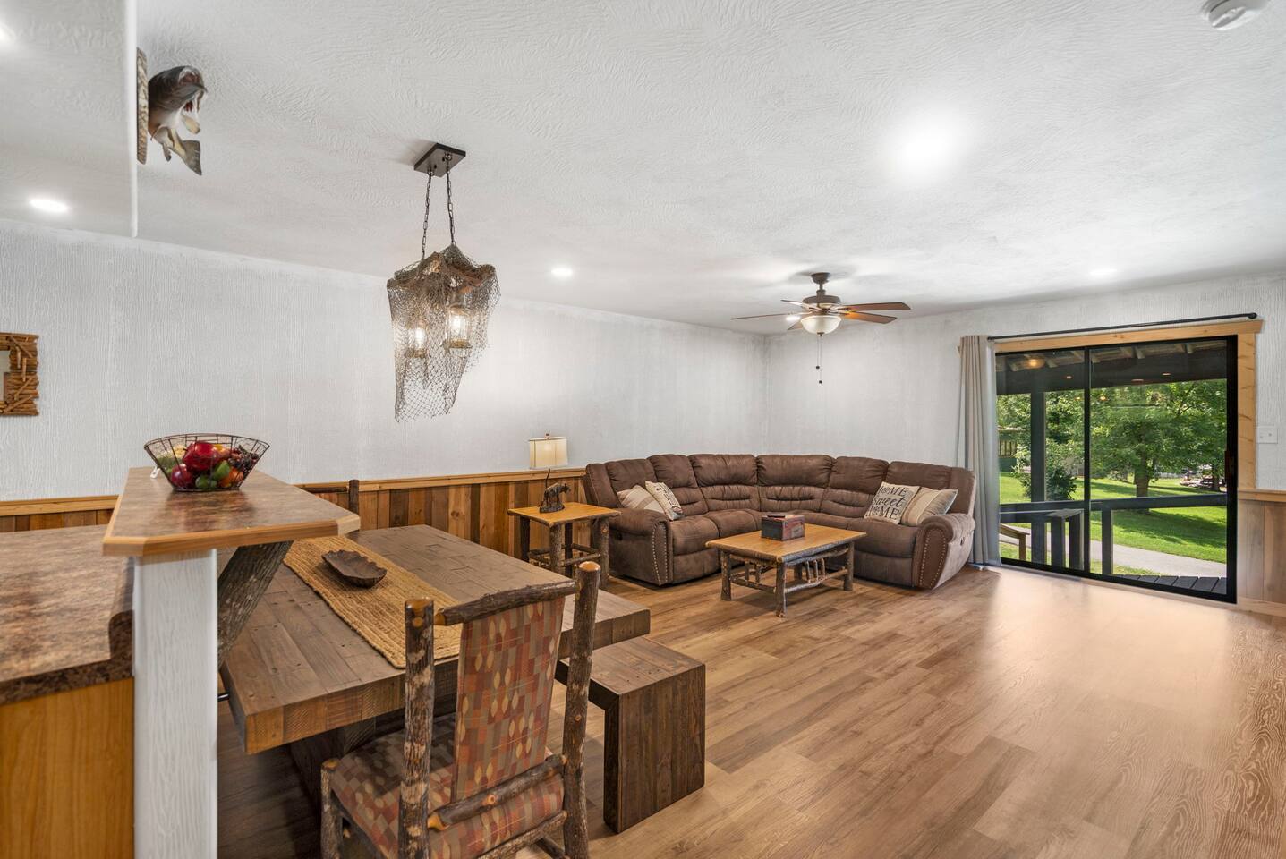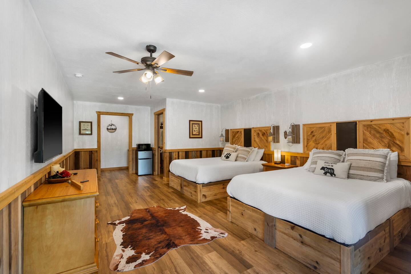 Imagine sipping your morning coffee from the huge covered porch overlooking the lake and beautiful surroundings. The 4 Bears Lodge is perfect for those large families or groups of friends who want to spend their days together but want to have a separate place to reside at the end of the day. Each unit at 4 Bears Lodge has it's own exterior access with a sliding glass door to the outside. Watch a beautiful sunset on the lake or sit and listen to the crickets and sounds of the fresh country air.