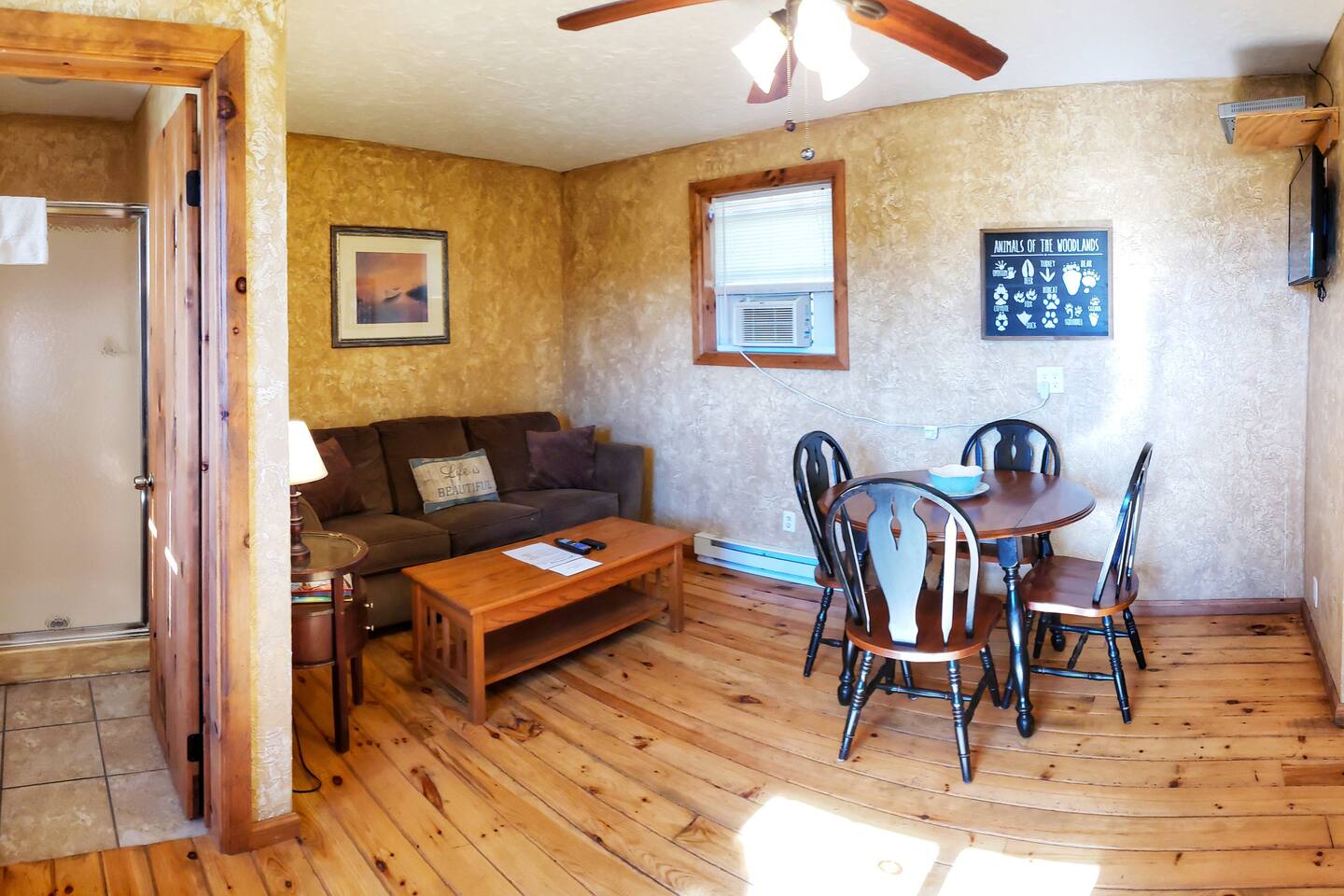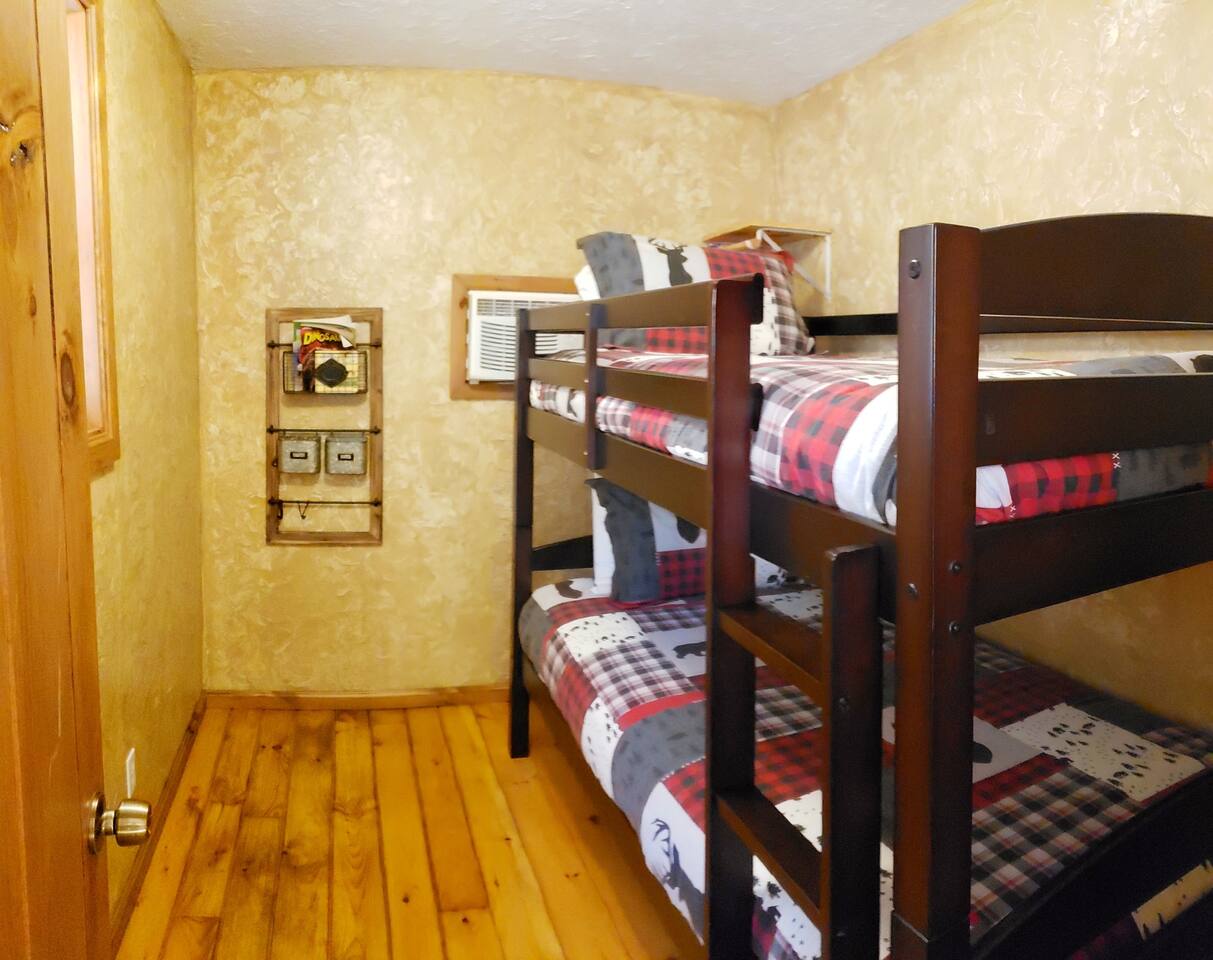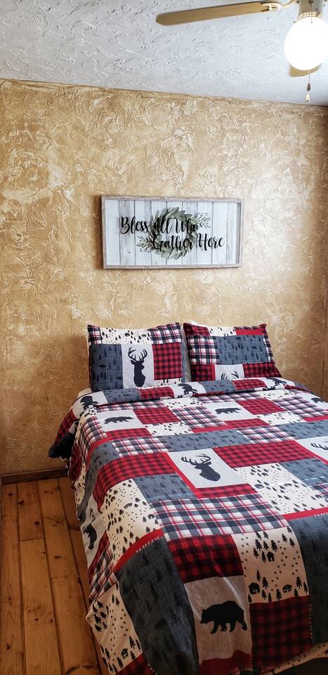From the moment you walk in you feel as if you are at a special retreat at the lake. The cabin has a rustic theme and the outdoor space comes to life at night with the campfire and string lights. The BBQ and fire pit area is a shared space.