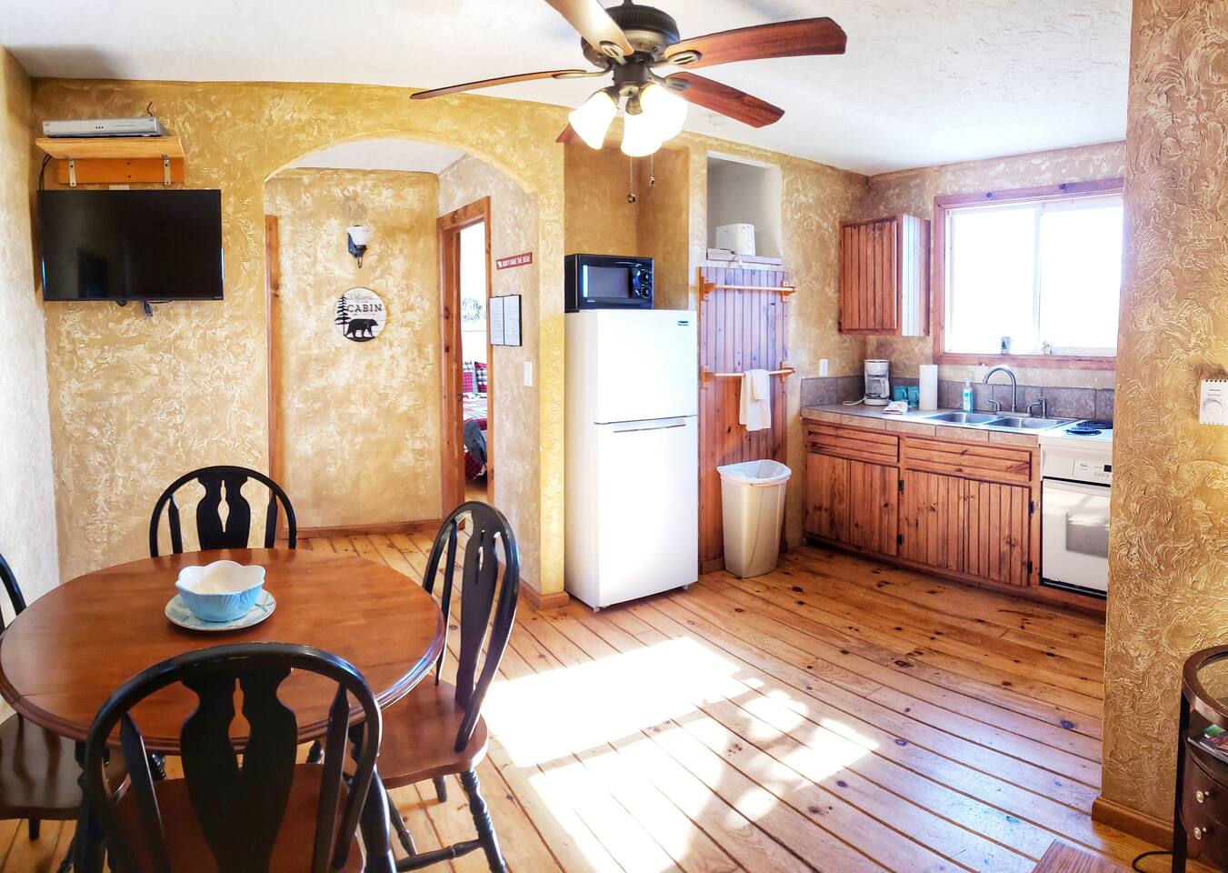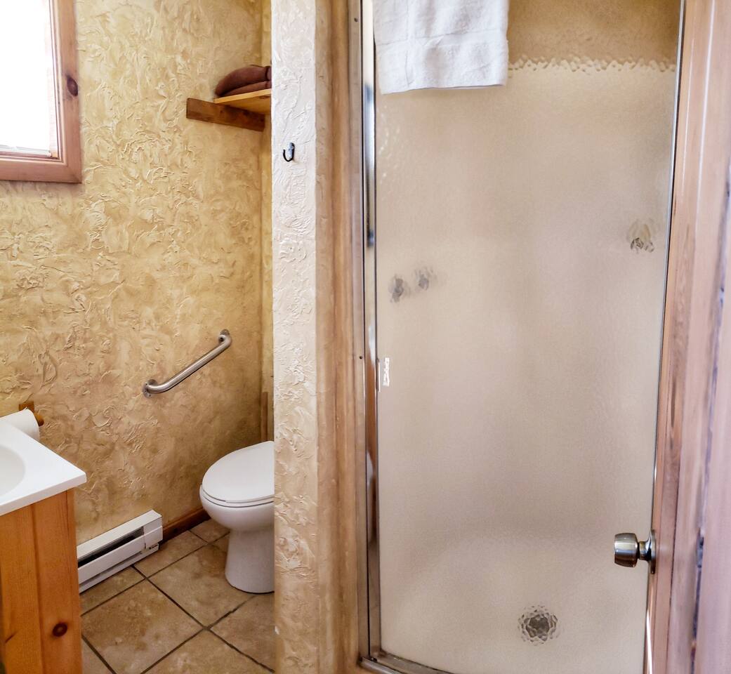 The cabin is located about 2 blocks away from the public fishing peninsula and lakeside marina. Walk right past the Pizza Cellar on the way to the lake and enjoy a sunset picnic next to the water. Bait and tackle can be found at Rainbow Haven where you can also rent a boat or kayak for an adventure.