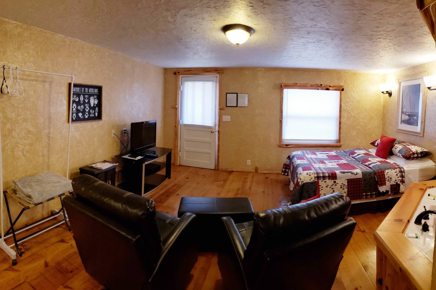 The cabin is located about 2 blocks away from the public fishing peninsula and lakeside marina. Walk right past the Pizza Cellar on the way to the lake and enjoy a sunset picnic next to the water. Bait and tackle can be found at Rainbow Haven where you can also rent a boat or kayak for an adventure.